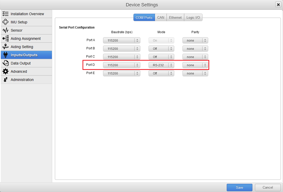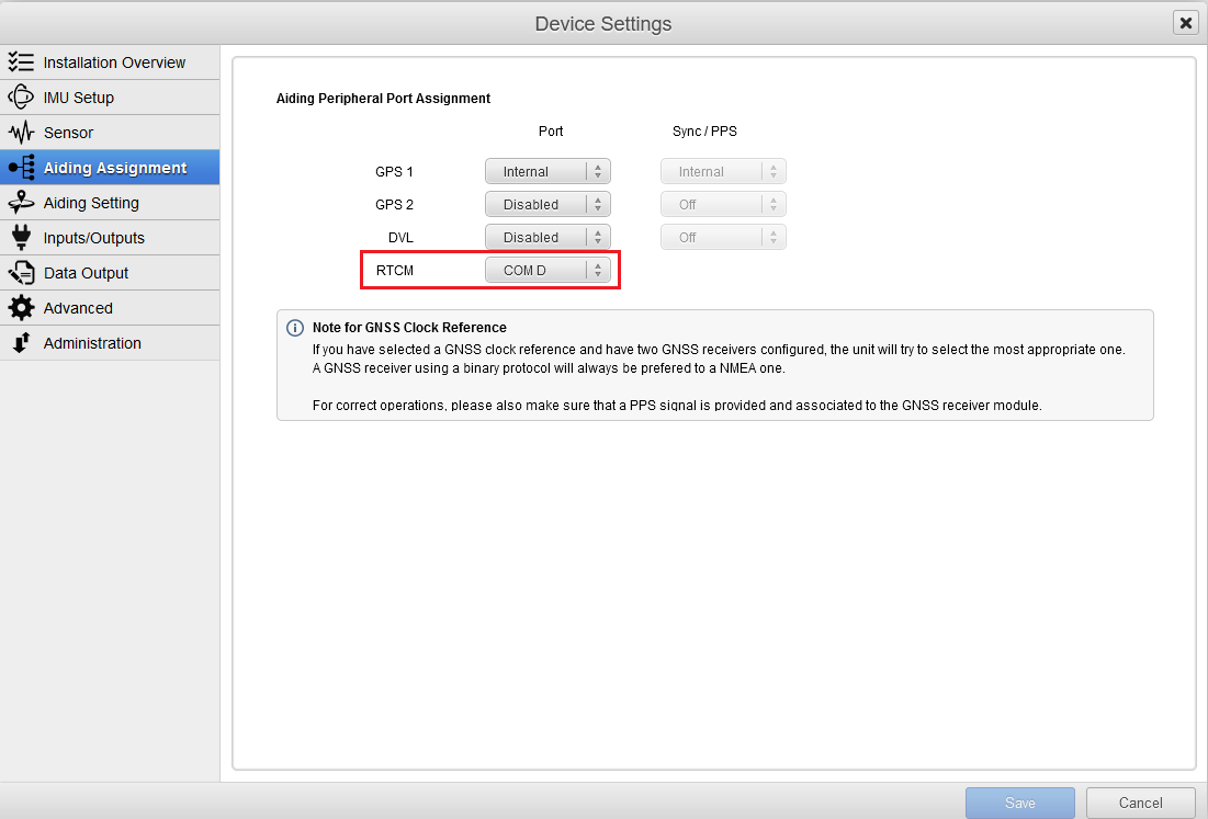 Most serial or Ethernet ports can be used to receive corrections, the example below uses the serial port D to receive RTK corrections in Configuration, Aiding Assignment, RTCM.