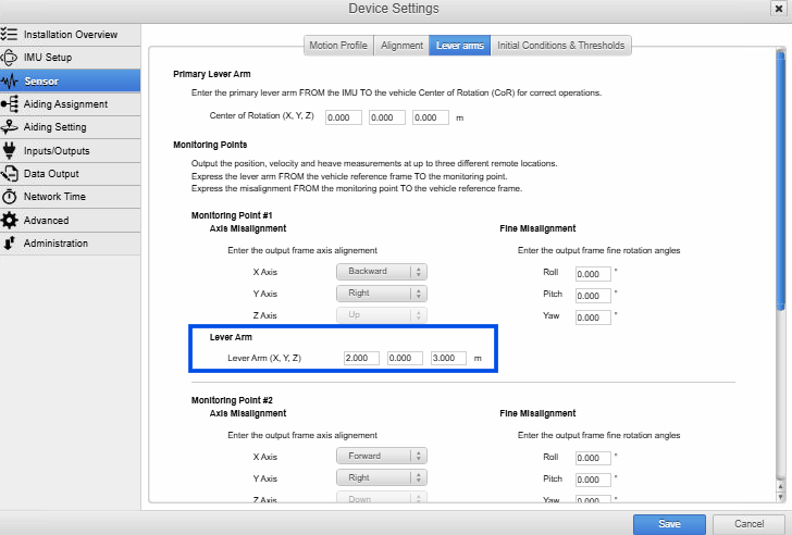 The lever arms should be entered from in the vehicle reference frame FROM the IMU reference point TO the monitoring location.