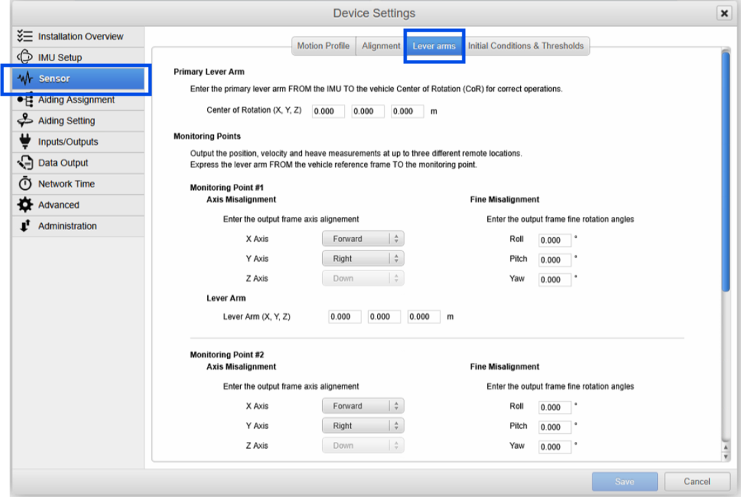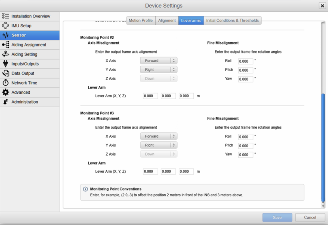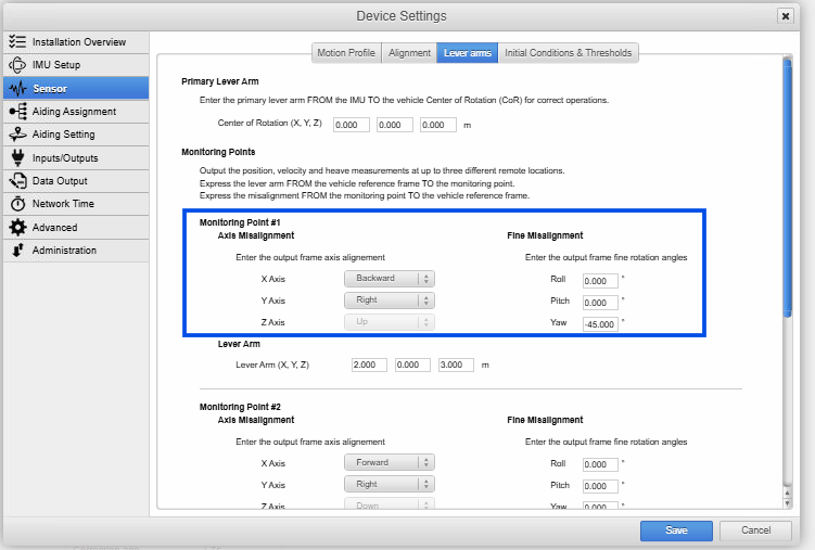 The monitoring points are used to measure the data out of the Kalman Filter at defined locations on your vehicle. They are also used to realign the outputs to the reference frame of another system such as a Lidar, or a camera for example.