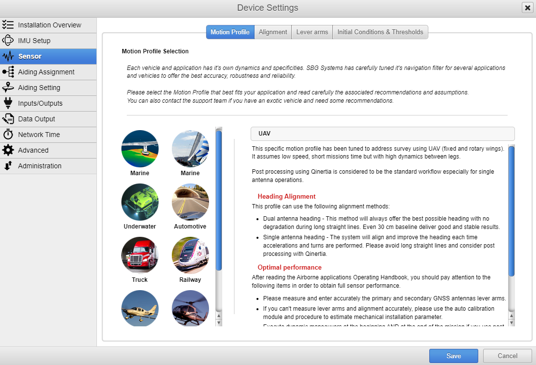 After configuring the alignment and the lever arms of the INS, you should configure the aiding you will use: