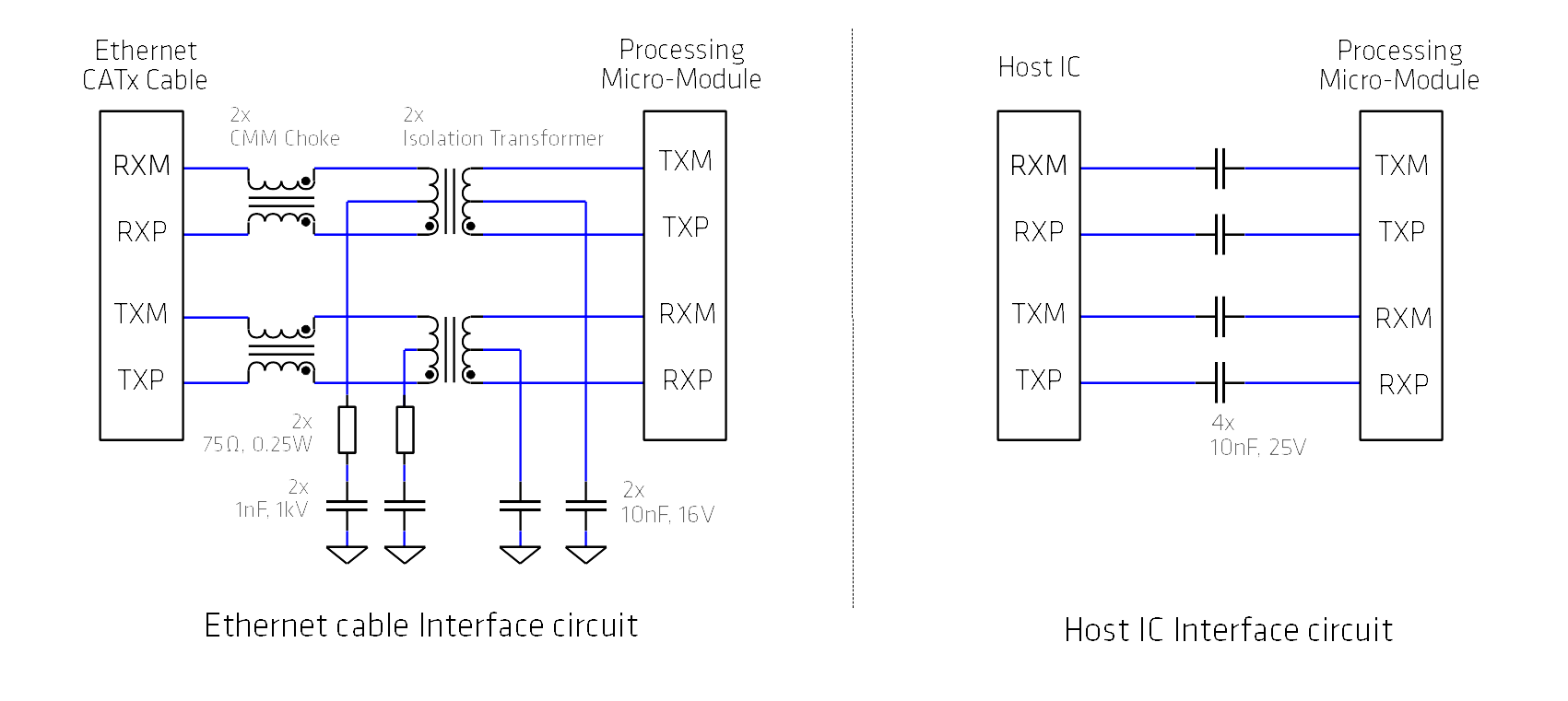 When the connection involves a long distance communication (typically, when there is a cable), the first implementation is required. When the device is located on the same electronic board, it is possible to select an easy circuit with capacitors.
