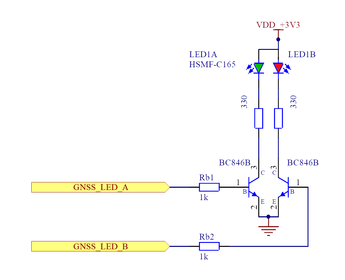 The LEDs output pins are defined as 1 = LED ON; 0V = LED OFF. For each, a LED A signal corresponds to a GREEN light and LED B corresponds to a RED light. Both signals should be put in a single LED component in order to achieve the corresponding color code :