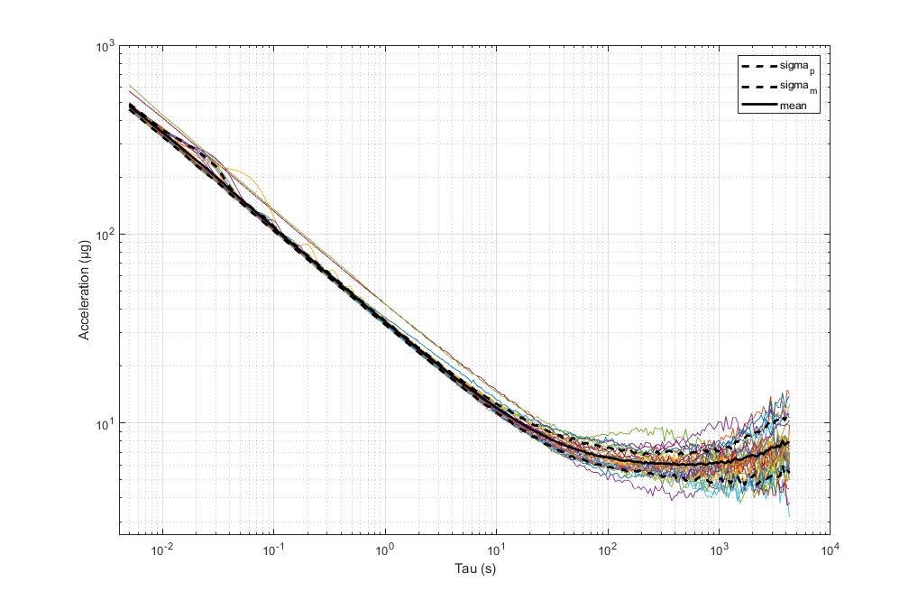 This drawing shows accelerometers Allan variance for 32x Pulse-40 accelerometers. More information on Allan Variance in the Knowledge center.