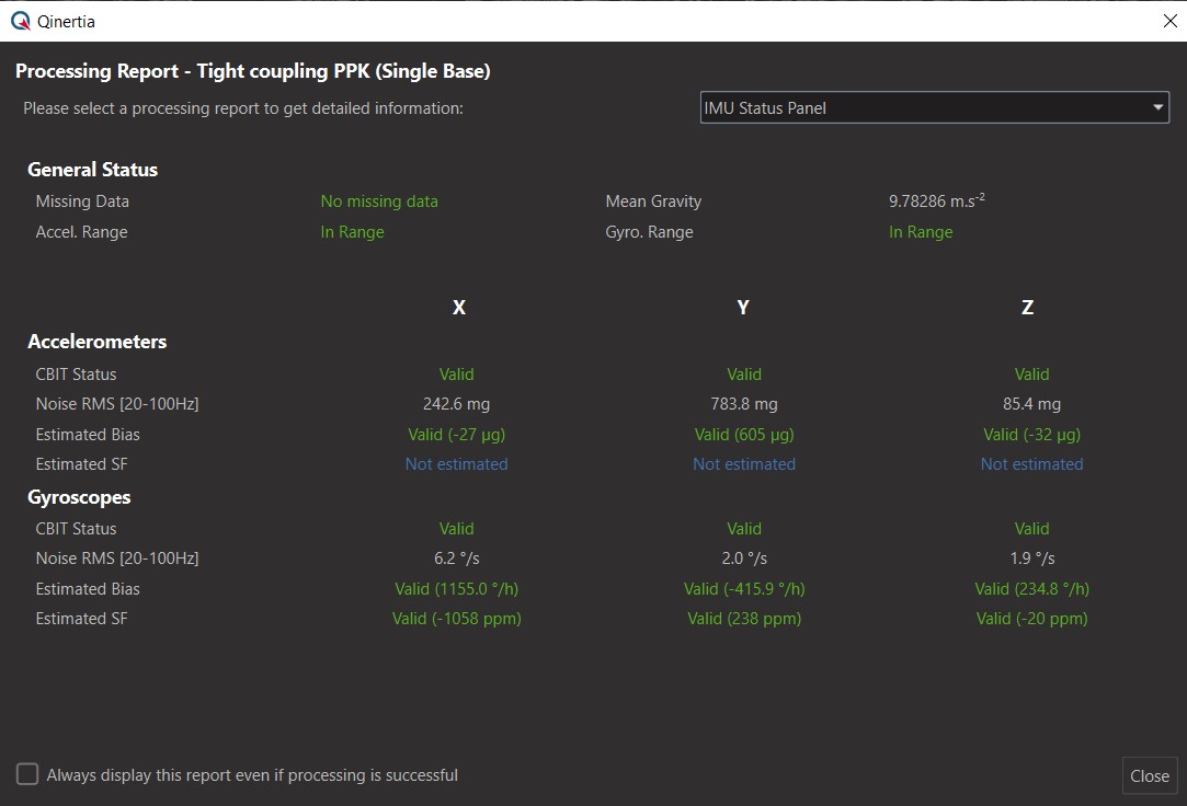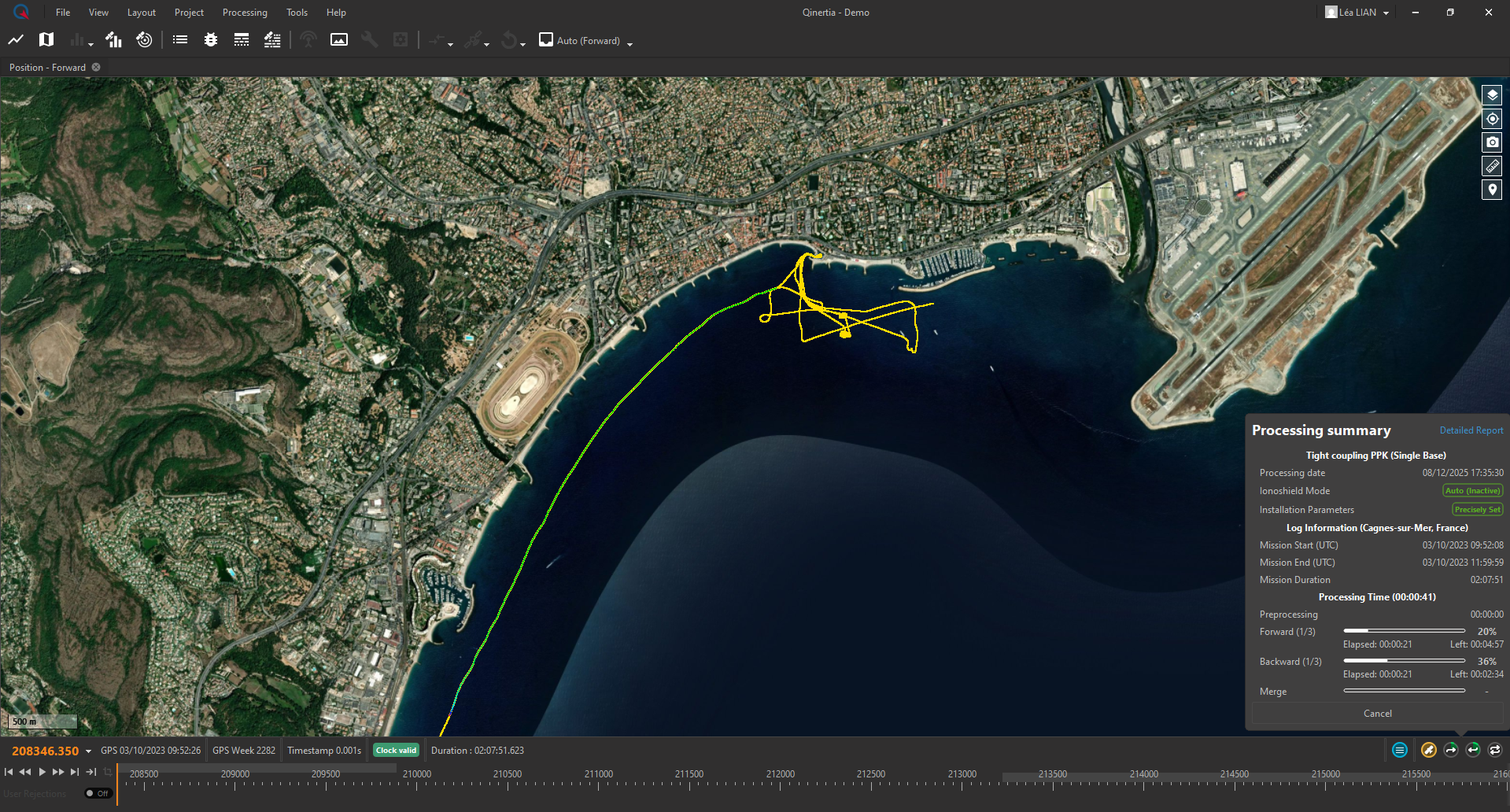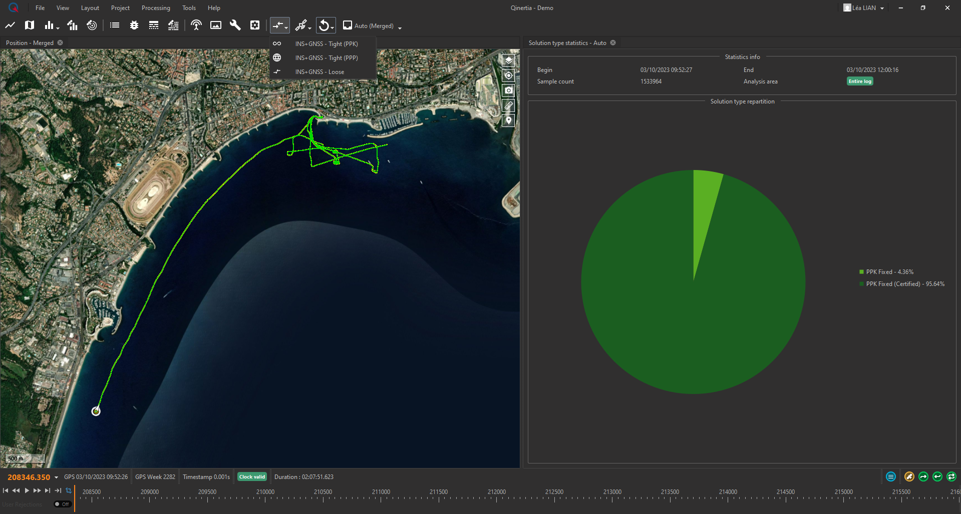 The project has been created and it's now time to process it. Qinertia offers several processing mode from GNSS only to fully tightly coupled INS PPK solution. Please read Processing a Log to get more details about all available processing modes and options.
