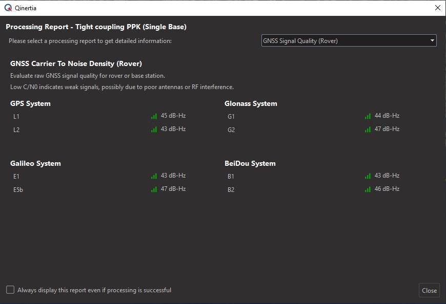 In our example, the processing went well and the pre-processing report shows good GNSS data quality for both the rover as well as the GNSS base station.