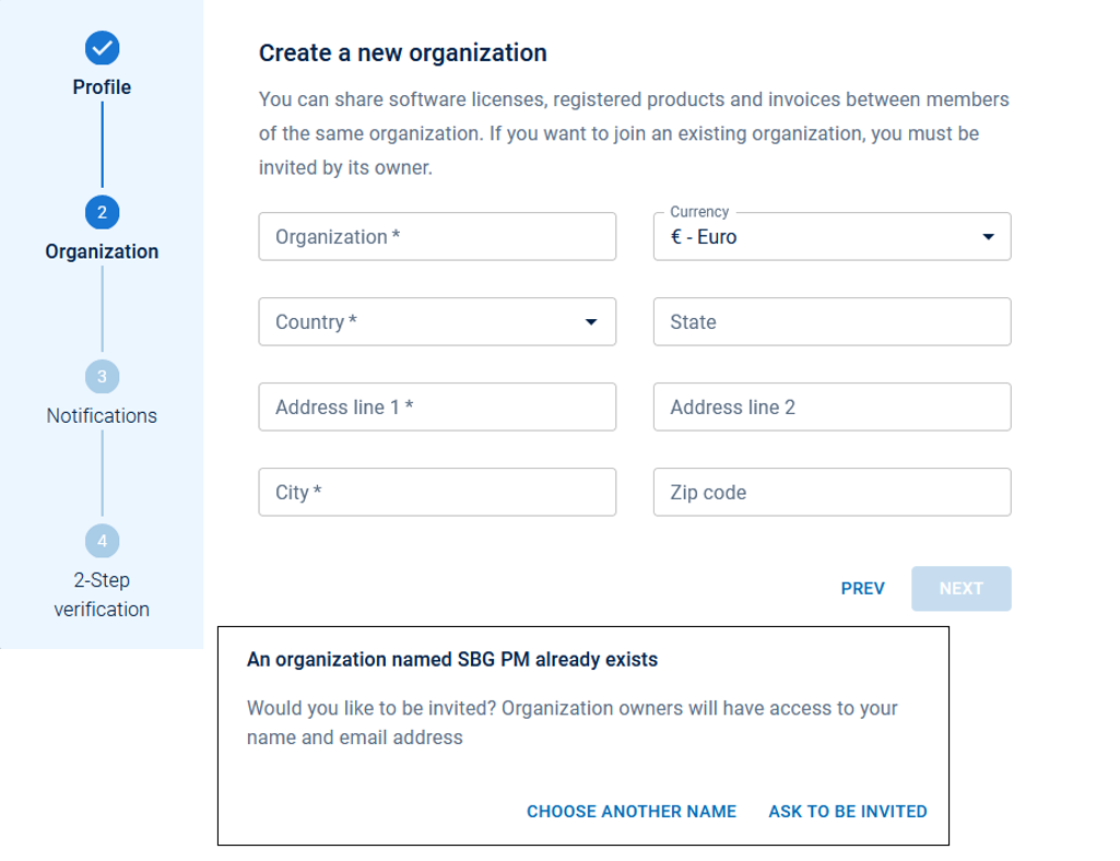 Upon your initial login, it is essential to establish your organization. Each Qinertia license is tethered to an organization, which facilitates the sharing of Qinertia licenses among all accounts within the same organization. If your company has already established an organization within MySBG, the organization's administrator will receive an invitation request.