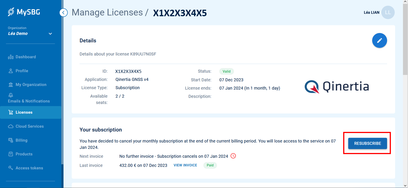 You can easily resubscribe to your Qinertia subscription at any time, simple navigate to the license page and click the "Resubscribe" button.