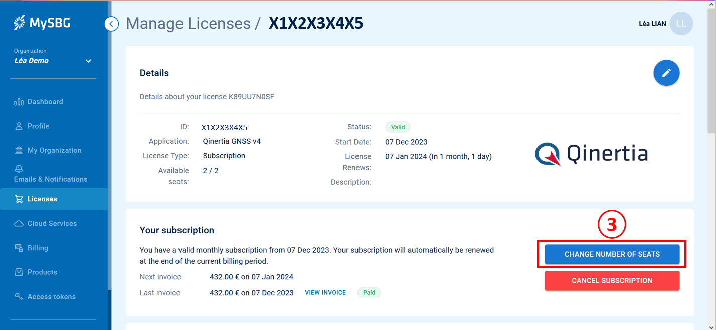 - Click on the "Change Number of Seats" button to modify the number of seats in your Subscription.